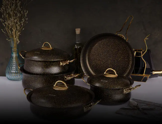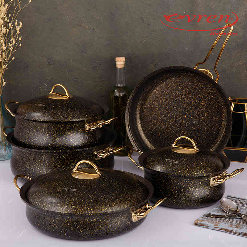 Evren Kitchen's specially designed Gold Stone Jupiter 9 Pcs Set offers first-class quality that will highlight your talents in the kitchen. This cookware is made of durable materials and designed for long-lasting use.