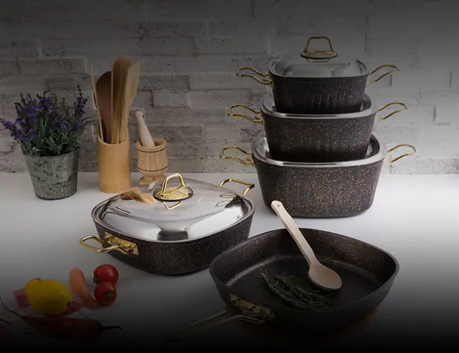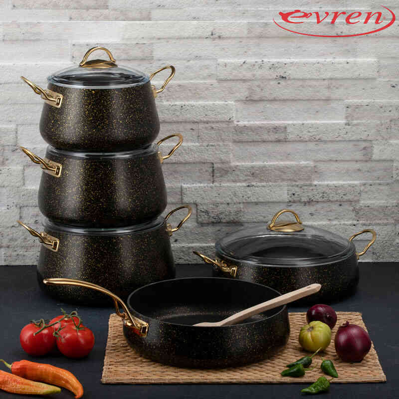 Evren Kitchen's specially designed Gold Stone Square 9 Pcs Set offers first-class quality that will highlight your talents in the kitchen. This cookware is made of durable materials and designed for long-lasting use.