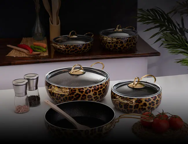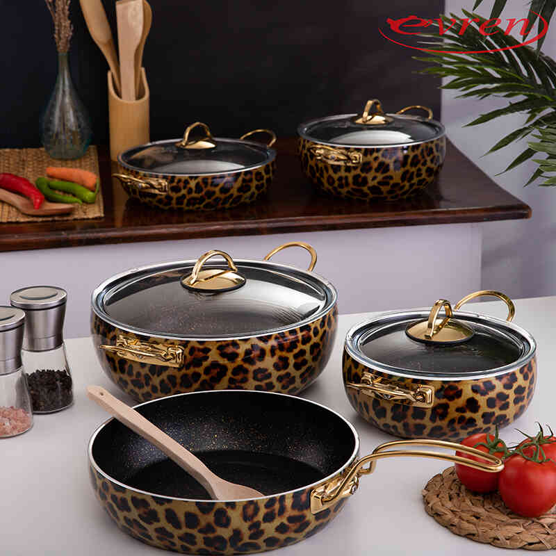Evren Kitchen's specially designed Leopard 9 Pcs Set offers first-class quality that will highlight your talents in the kitchen. This cookware is made of durable materials and designed for long-lasting use.