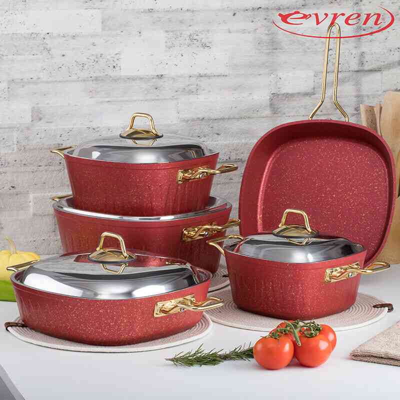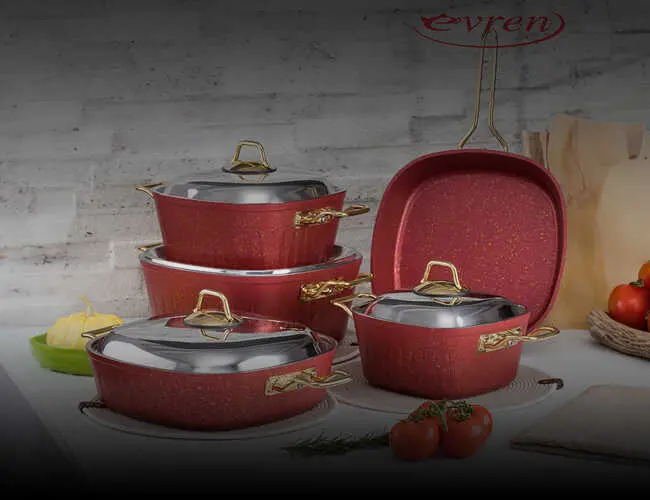 Evren Kitchen's specially designed Red Square 9 Pcs Set offers first-class quality that will highlight your talents in the kitchen. This cookware is made of durable materials and designed for long-lasting use.