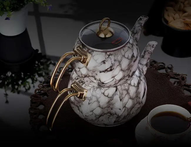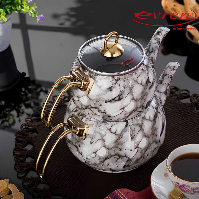 Evren Kitchen White Marble Teapot Set stands out with its longevity and durability. The lid holder and handles are designed to be compatible with the Kettle and also offer a stylish appearance